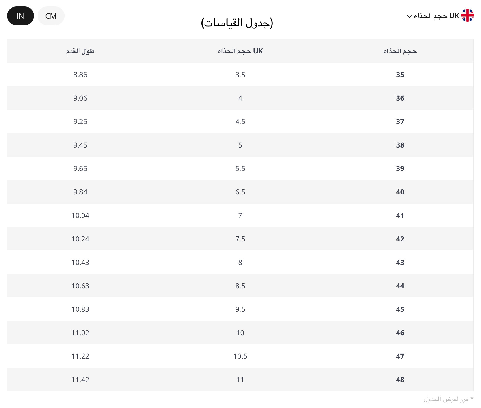 رجاء ملاحظة أن قياس طول القدم في جدول القياسات بالإنش ....
